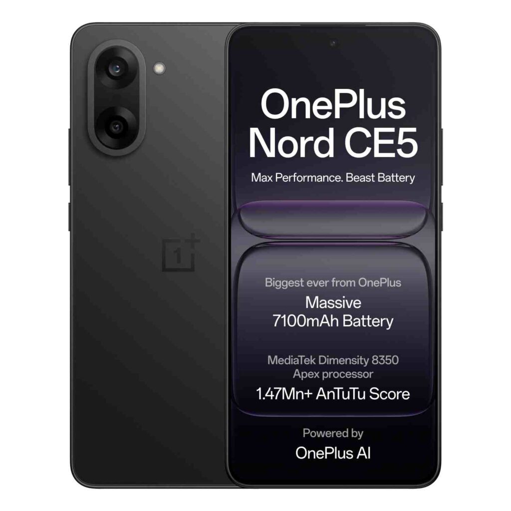 If you are looking for a smartphone with amazing battery life, the OnePlus Nord CE5 is a strong contender. It packs a massive 7100mAh battery, which easily lasts more than a day even with heavy use. Powered by a MediaTek Dimensity processor and optimized with OnePlus AI features, this phone delivers smooth performance for multitasking and gaming.