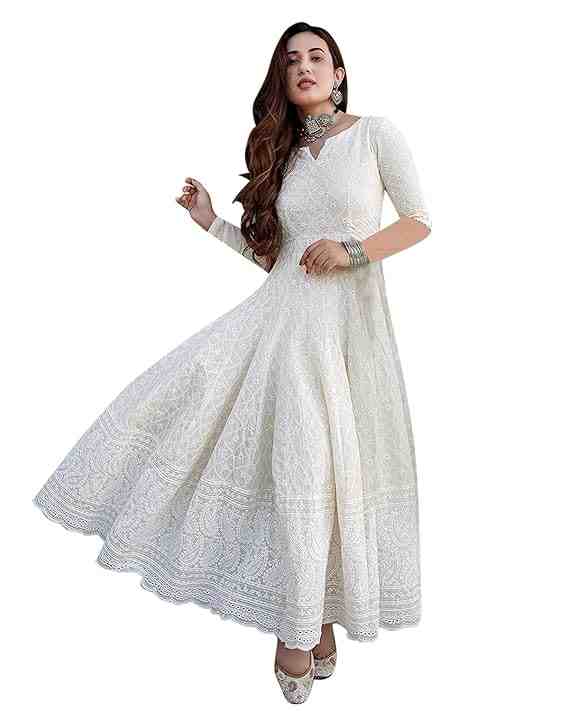 The white Anarkali base allows you to experiment with bright accessories and festive touches.