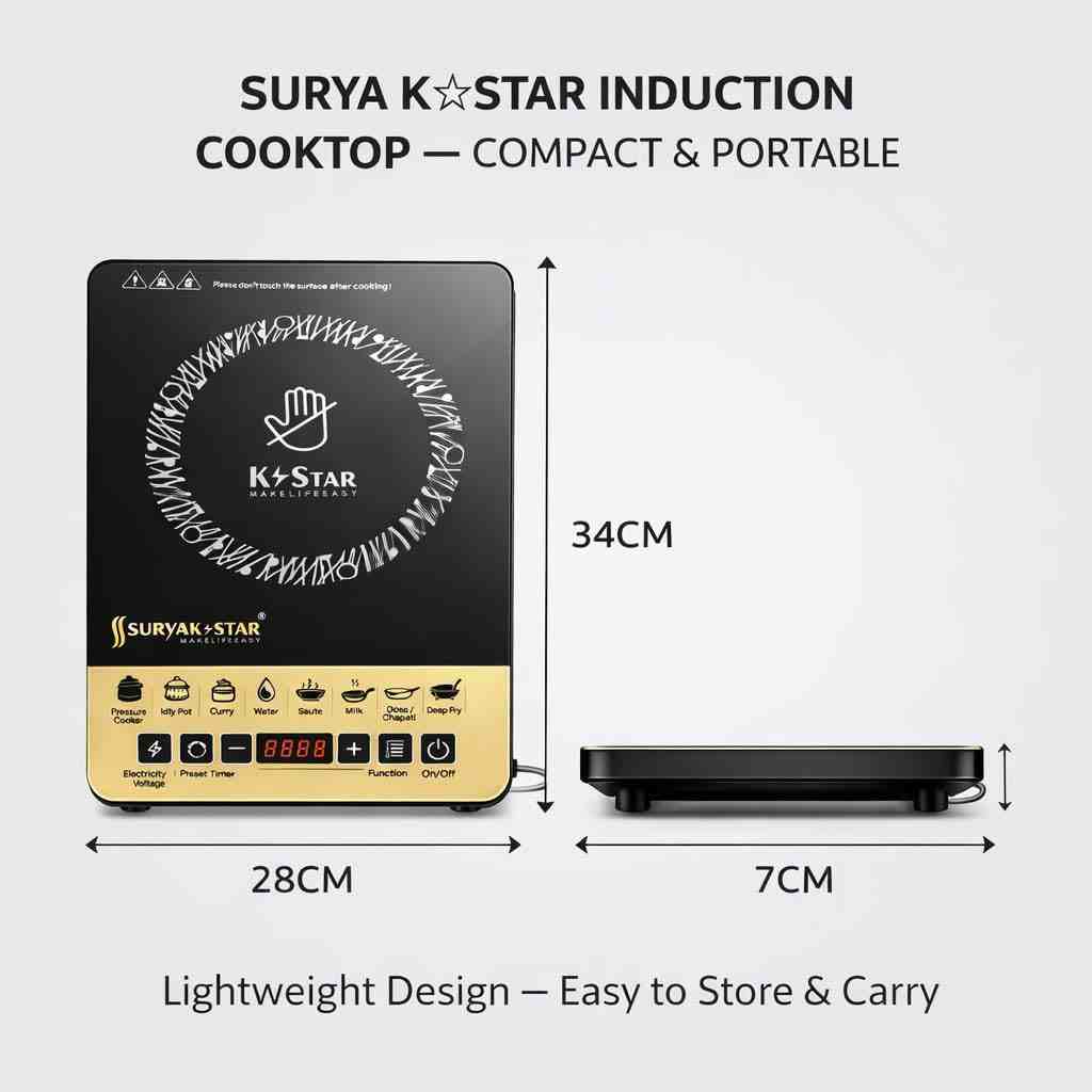 On paper, most induction cooktops may look similar, but the real difference shows in daily use. Cooking Indian food is not just about boiling water or making noodles. It includes roti, sabzi, frying, and sometimes heavy pressure cooking. The Surya cooktop focuses on practical daily cooking. With 2000W power and 8 preset Indian cooking modes, it feels very beginner-friendly. You don’t have to think much about settings. Just choose a mode like rice, dosa, or frying, and it adjusts automatically.