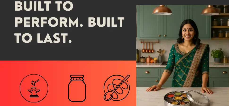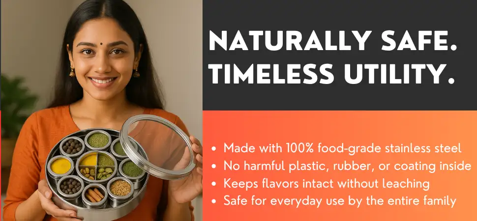 “This masala dabba keeps my spices perfectly organized and fresh. It looks elegant, is easy to clean, and the quality is top-notch. Highly recommend it!”
