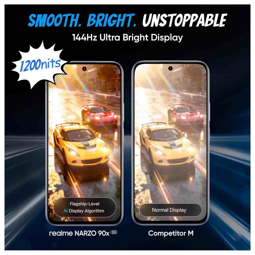 The realme NARZO 90x 5G features a 144Hz Ultra Smooth LCD display that feels surprisingly fluid for its segment. Scrolling through apps, gaming, and switching between screens feels noticeably smoother compared to standard 60Hz or even 90Hz displays. The 1200 nits peak brightness makes outdoor visibility much better, especially under direct sunlight, where many budget phones struggle.